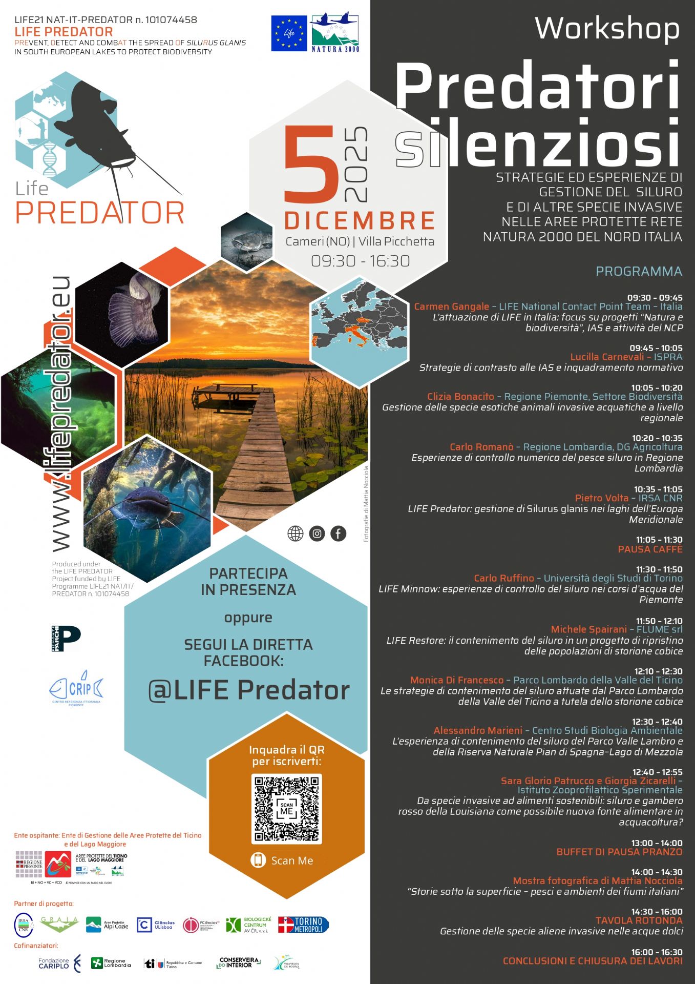Venerdì 5 dicembre, dalle ore 9:30 a Villa Picchetta (Cameri, NO), si terrà il Convegno "Predatori silenziosi. Strategie ed esperienze di gestione del Siluro e di altre specie invasive nelle aree protette Rete Natura 2000 del Nord Italia".